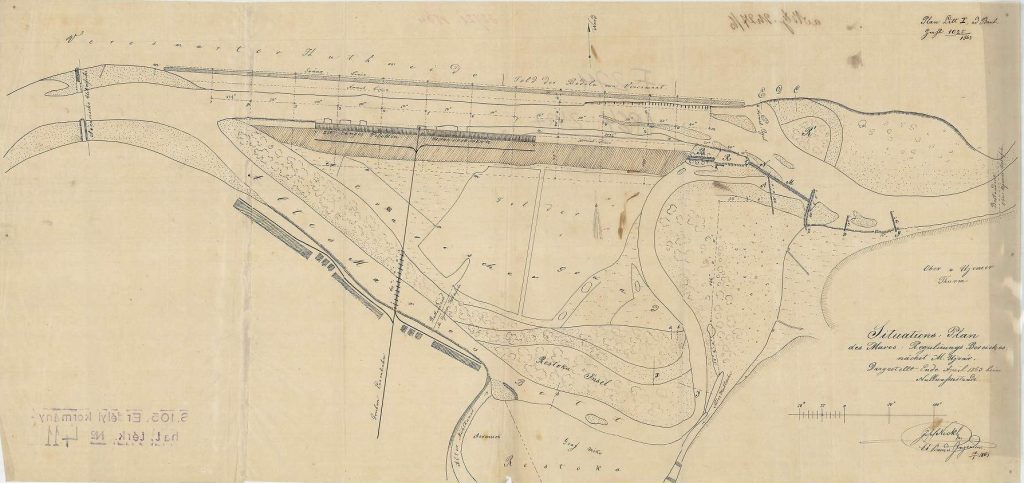 Ps. Prietenul nostru, domnul Kolozsvari Csaba, pasionat de istorie așa cum îl știm a postat recent un plan de regularizare a râului Mureș , de fapt o schiță topografică din anul 1869. Acest plan făcea parte dintr-un amplu proiect al guvernului austriac început în anul 1847 prin care s-a urmărit îndreptarea și scurtarea cursului râului Mureș prin tăierea meandrelor, începând de la Szeged până la Tg. Mureș. Pentru fiecare localitate limitrofă Mureșului, s-au întocmit astfel de planuri. Scopul proiectului era de a reda agriculturii noi terenuri din lunca Mureșului, de a stăvili revărsările Mureșului și de a face din acest râu o arteră de navigație până la Tg. Mureș. Proiectul a fost abandonat în 1872 pentru că între timp s-a finalizat construcția căii ferate Szeged-Tg. Mureș. Ocna Mureș a fost conectată în 1872 la gara Războieni printr-o cale ferată secundară construită cu investiția Salinei. Astfel a încetat transportul sării cu plutele. O victimă colaterală a acestor schimburi în rutele de transport pentru sare a fost cel mai mare afacerist și cel mai bogat din Ocna Mureș, Grun Israel. Acesta avea firme profitabile din afacerile cu Salina. Grun Israel concesionase transportul sării de la statul austriac, folosindu-se de sutele de plute. Avea un proiect și a investit sume mari în construcția de nave cu motor. A comandat astfel de nave la un șantier naval din Anglia. Afacerea a falimentat în 1872. Condițiile financiare s-au înrăutățit, tulburând mult viața lui Grun Israel. (vezi necrolog în ziarul Magyar Polgar, Ianuarie 1881).