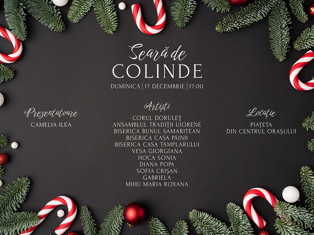 Suntem fericiți să vă anunțăm că tradiția merge mai departe: duminică, 17 decembrie 2023, de la ora 17.00 sunteți așteptați la o nouă ”Seară de Colinde ” în piațeta din centrul orașului Ocna Mureș. Ne vor colinda: