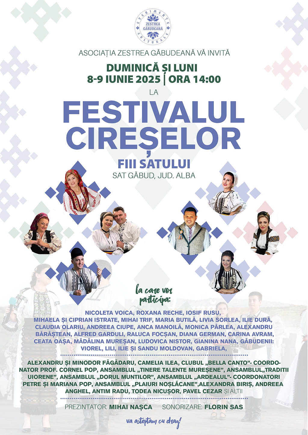 ”Zestrea Găbudeană vă invită la cea de-a VIII-a ediție a ”Festivalulul Cireelor Fiii Satului”, în localitatea Găbud, județul Alba și am fi bucuroși să împărtășim aceste zile de distracție cu un număr cât mai mare de spectatori. Vă așteptăm cu drag!” au transmis organizatorii.