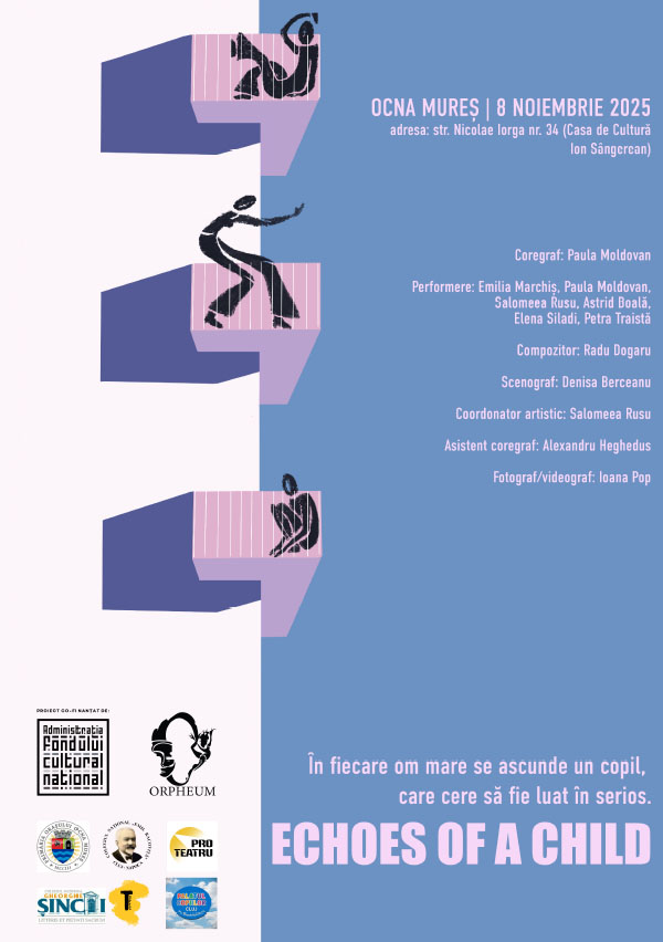 Sâmbătă, 8 noiembrie 2025, de la ora 18.00, la Casa de Cultură „Ion Sângereanu” din Ocna Mureș, Compania de teatru și dans Orpheum Community, din Cluj-Napoca, vă invită la spectacolul „Echoes of a Child” – o călătorie coregrafică despre psihologia tipurilor de atașament din copilărie și întâlnirea vindecătoare dintre copil și adultul conștient. Echipa artistică reunește profesioniști cu experiență: