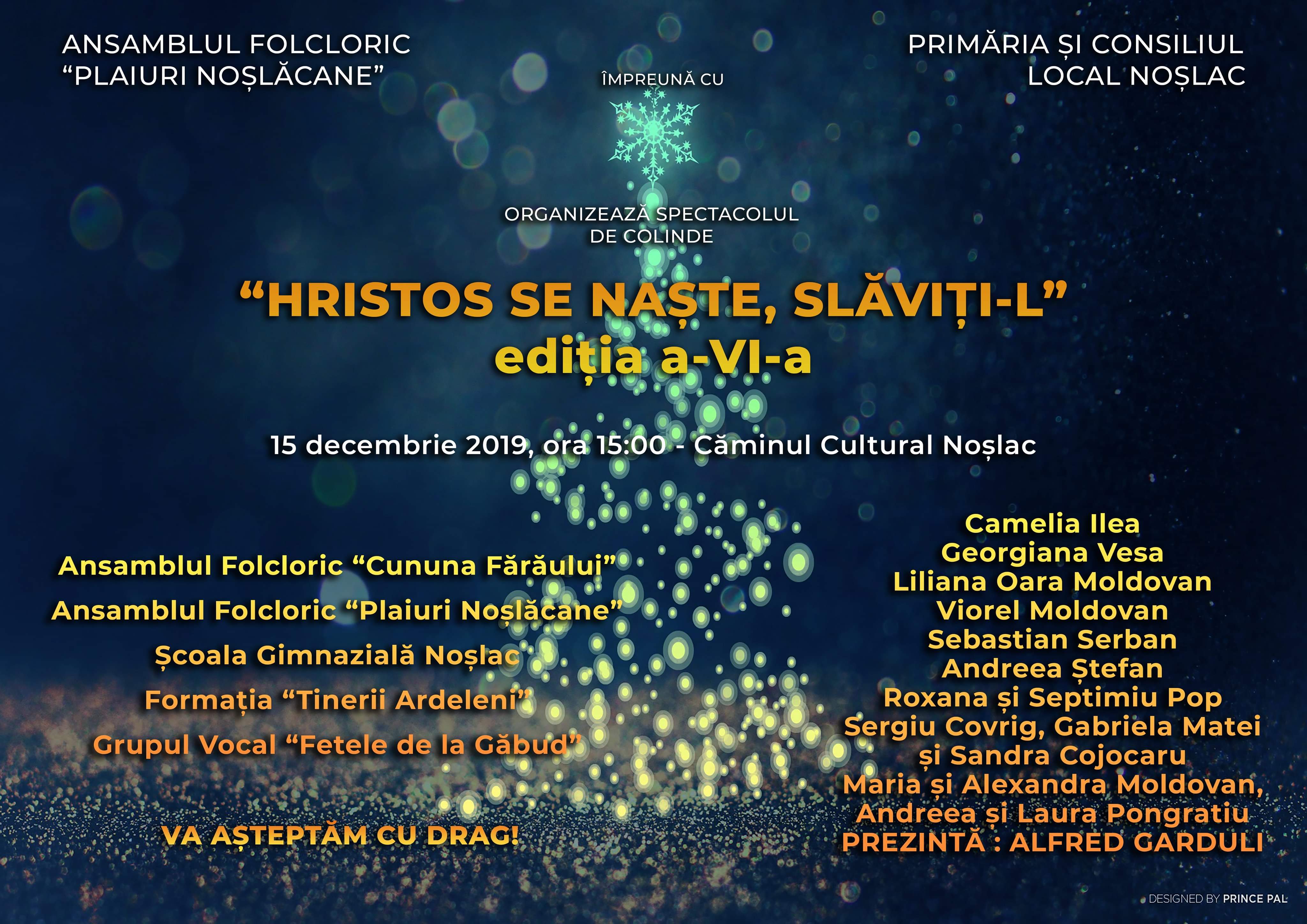Ansamblul Folcloric „Plaiuri Noșlăcane” împreună cu Primăria și Consiliul Local Noșlac au deosebita plăcere de a vă invita să fiți părtași la cea de a-VI-a ediție a spectacolului de colinde „Hristos se naște, Slăviți-L!”.