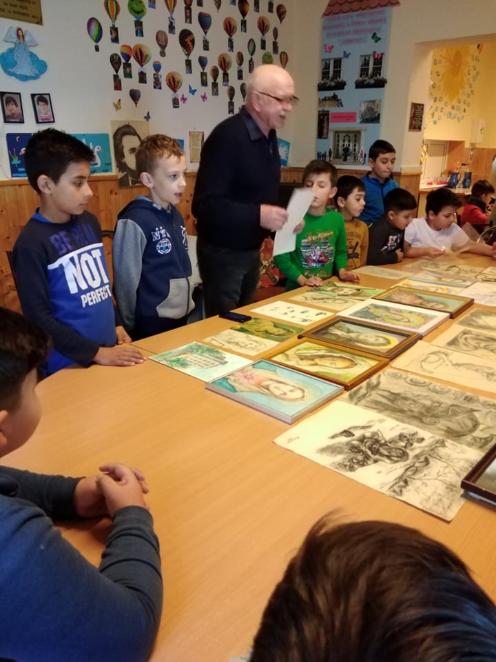 Ne-am obișnuit cu el, vorbește puțin și încet, ceea ce ne face pe noi să nu mai vorbim, ca să-l auzim. Noi îl știam din sat, că doar e de la noi, dar nu știa niciunul din noi ce frumos desenează, nici măcar Matei nu ne-a spus. La a doua noastră întâlnire ne-a dat foile de lucru, creioanele și ne-a spus ce dorește să desenăm. Ne-a lăsat apoi liberi, doar trecea printre noi și ne spunea unul- două lucruri, pe care să le facem. Odată a întrebat pe cineva: “Mă lași să-ți stric puțin desenul?” Și nimeni nu l-a lăsat, doar Matei i-a zis că-l lasă și atunci Pictorul a tras doar câteva linii și gata, desenul parcă prinsese viață! Nu ne-a trebuit mult să strigăm care mai de care: “Imi strici și mie puțin desenul?”