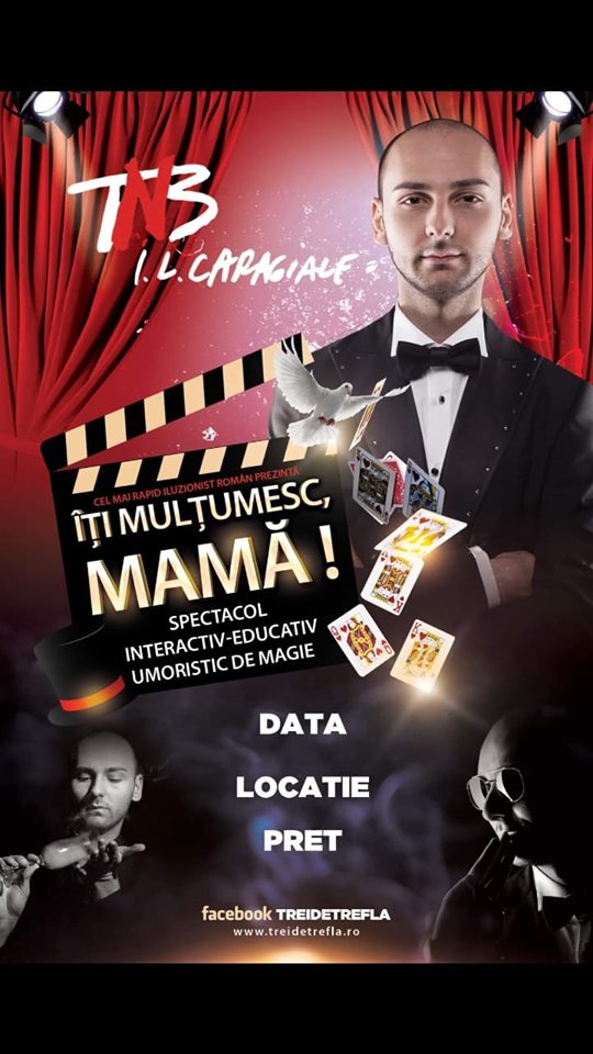 9 Iulie 2019 , ora 19 – Casa de Cultură ,,Ion Sângerean ,, Ocna Mureș vă invită la un spectacol de teatru interactiv-educativ, umoristic de magie intitulat „ÎȚI MULȚUMESC, MAMĂ!”, susținut de Marcu Alexandru, actor Teatru Național București!
