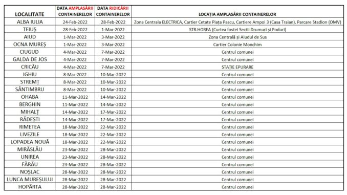 Cetățenii din localităţile menţionate pot depune prin aport voluntar și gratuit deșeurile voluminoase și periculoase din menajer în containerele special puse la dispoziție în punctele de colectare.