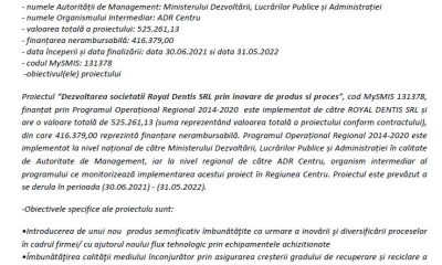 titlul proiectului: Dezvoltarea societatii Royal Dentis SRL prin inovare de produs si proces numele beneficiarului: ROYAL DENTIS SRL numele programului: Programul Operațional Regional 2014-2020 numele Autorității...