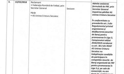 Unirea Cristuru Secuiesc nu deţine Certificatul de Identitate Sportivă (CIS), motiv pentru care nu a fost acceptată participarea sa în barajul de promovare în eşalonul terţ....